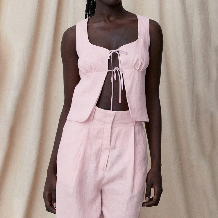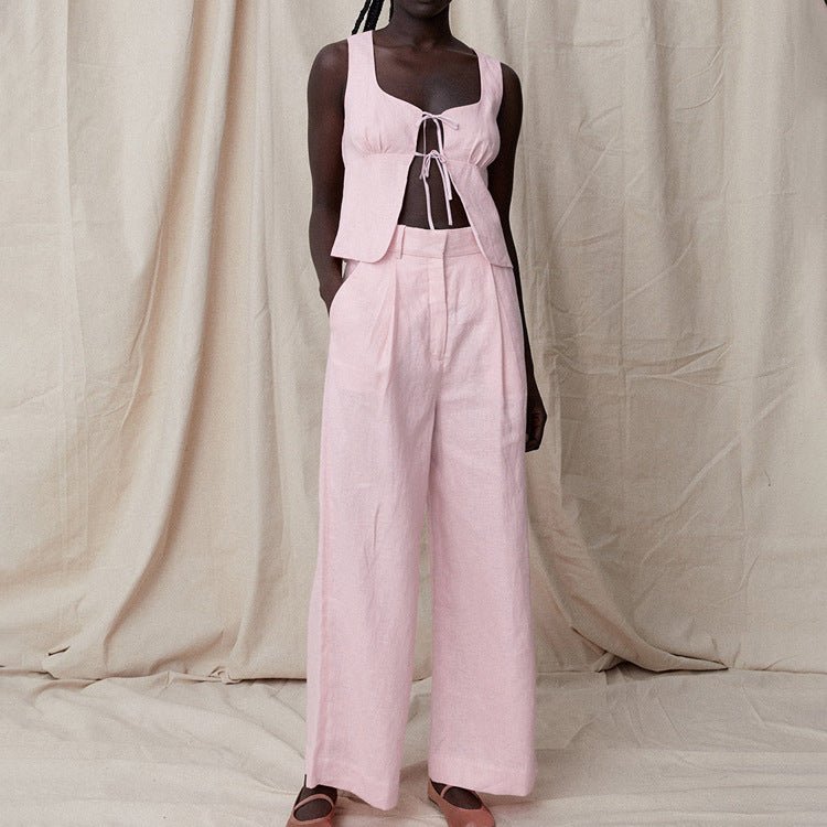 Featuring a lace-up front crop top and wide-leg high-waisted pants, this breathable cotton blend brings comfort and confidence together. The soft pink hue adds a romantic touch, perfect for garden parties, sunset dinners or any time you want effortless polish.