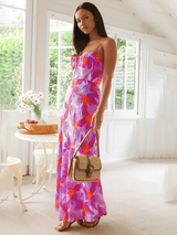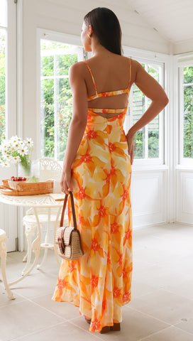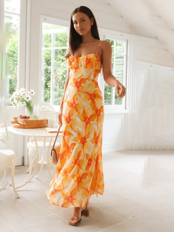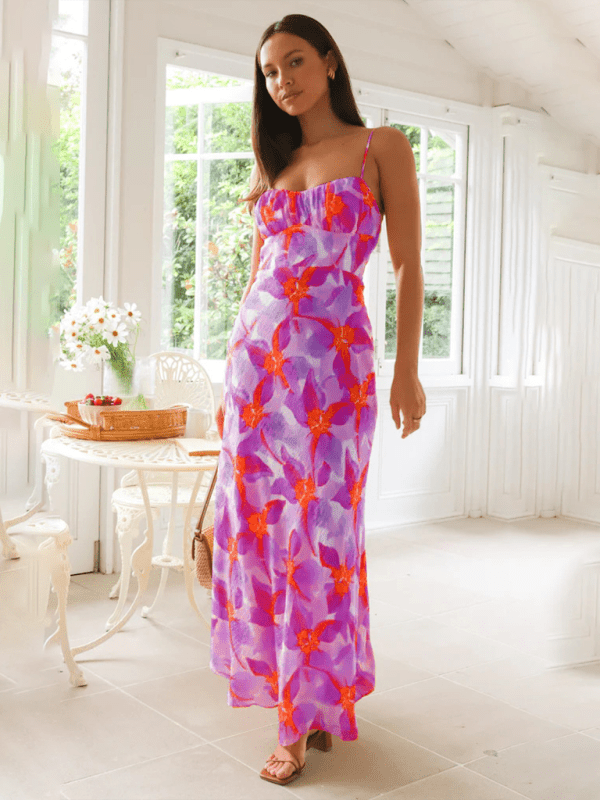 Meet your new statement dress: the Aurora Maxi Dress in a vibrant choice of either orange or purple floral print.