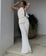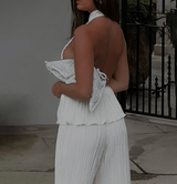 Featuring a halter neck top with soft pleats and high-waisted wide-leg pants, this breezy set moves beautifully with every step. It’s perfect for beachside cocktails, long lunches, or simply soaking up the sun in style.