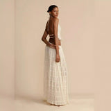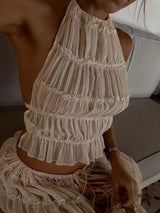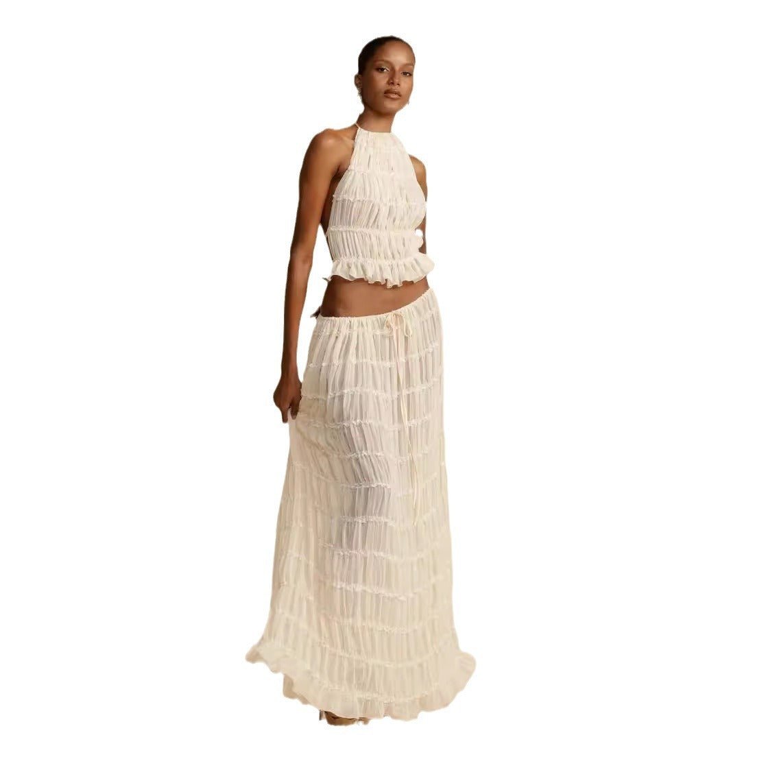 This dreamy set features a lace-up halter crop with an open back, paired with a flowing pleated chiffon skirt that transforms into a halter dress. Whether styled barefoot on the beach or with heels and gold for evenings, this 2-in-1 piece makes summer dressing simple and unforgettable.