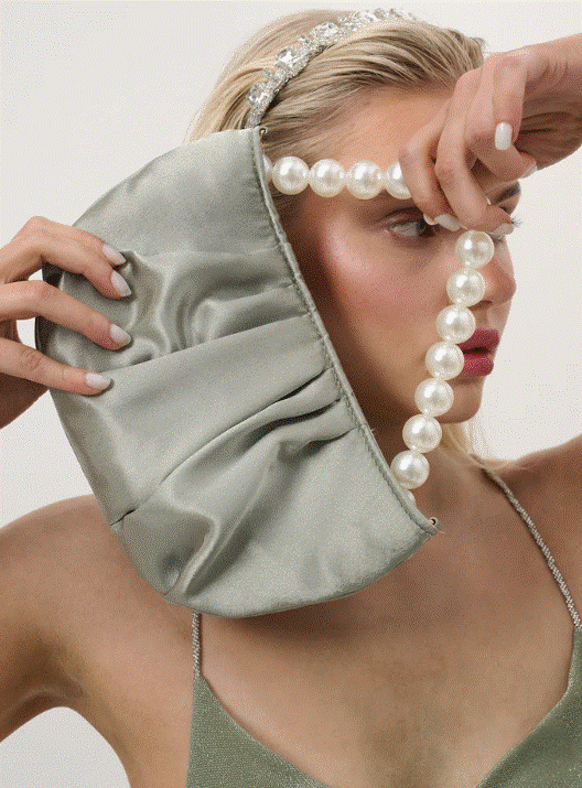 Crafted with a luxurious silky satin material and adorned with a stunning pearl strap, this bag is both fashionable and functional.